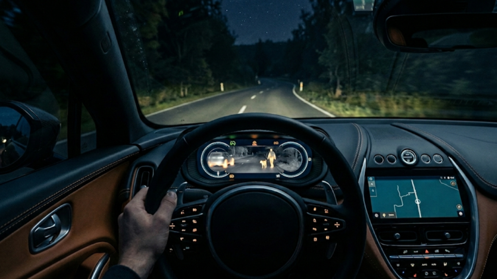 - Çalışma Dinamikleri: Aracın ön ızgarasına veya amblem arkasına yerleştirilen termal kamera, çevredeki her nesnenin sıcaklık farkını okur. Canlı varlıklar (yayalar, bisikletliler veya hayvanlar) cansız nesnelere (asfalt, ağaçlar veya park halindeki araçlar) kıyasla daha yüksek bir vücut ısısına sahip oldukları için sensör tarafından parlak beyaz veya sarı renklerde algılanır. Soğuk arka plan ise koyu gri veya siyah olarak ekrana yansıtılır.