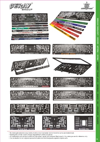 • Bu katalogda kullanılan araç marka model ve kod numaraları ürünleri tanıtmak amacıyla kullanılmıştır. KAMYON • KAMYONET • TIR • DORSE • RÖMORK • STOP SİNYAL LAMBALARI - TRUCK • TRAILER • BUSSES • LIGHTNING SYSTEMS