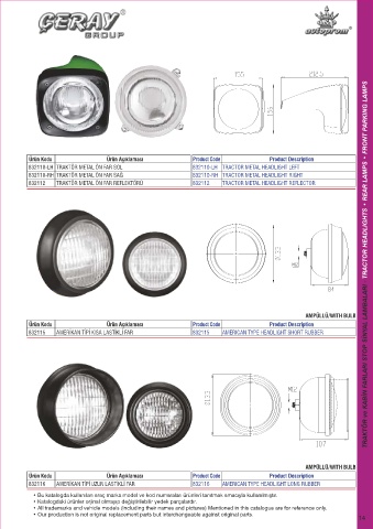 AMPÜLLÜ/WITH BULB TRAKTÖR ve KABİN FARLARI STOP SİNYAL LAMBALARI - TRACTOR HEADLIGHTS • REAR LAMPS • FRONT PARKING LAMPS